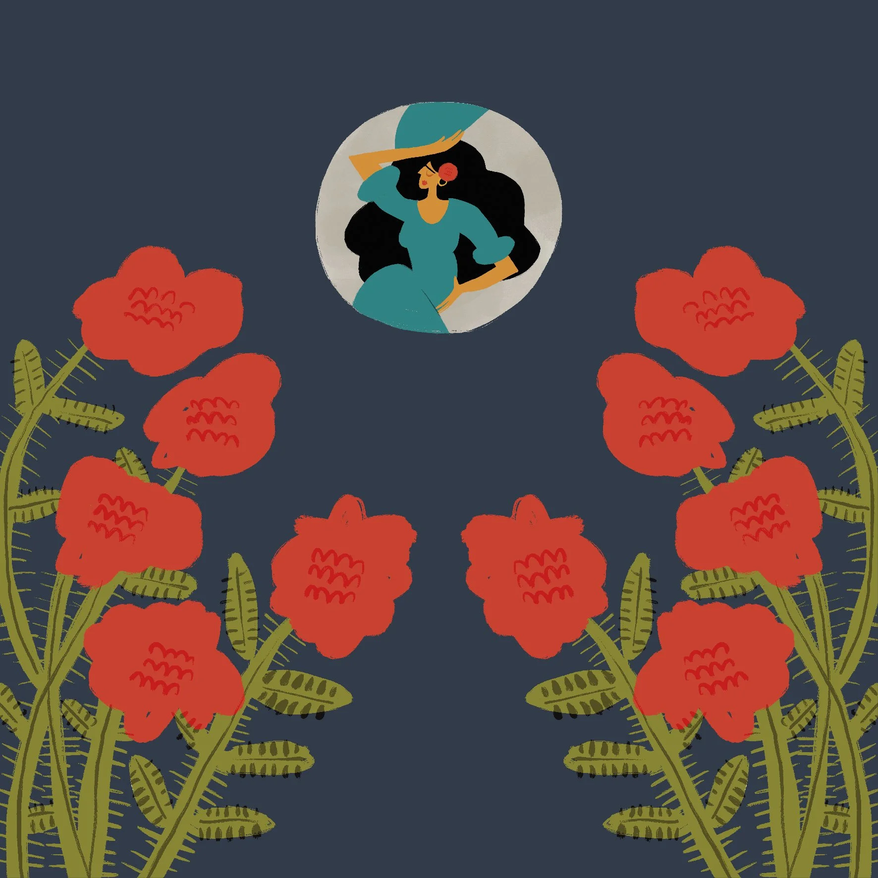 Finally, after my adventures with the Moon, I became the dancer I dreamt of being! I now wear a beautiful red skirt; my shoulders are draped in a red shawl of yellow flowers. I no longer have horns, because my body has changed; I dance with beautifully coloured fans, a dancing cane, and of course, my glorious red shoes. But the most beautiful thing I wear is a big red rose behind my ear that was a gift from Rosario when she finally accepted who I was.